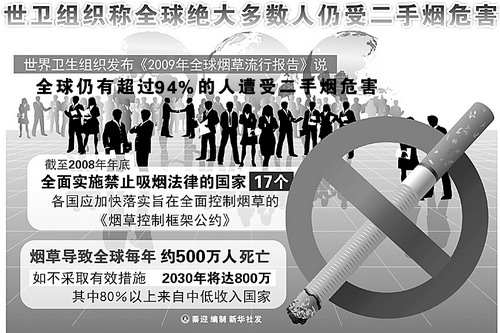 2008年4月14日,中華環(huán)保聯(lián)合會(huì)與北京市愛國衛(wèi)生運(yùn)動(dòng)委員會(huì)聯(lián)合發(fā)布了《北京市內(nèi)煙霧污染情況報(bào)告》,報(bào)告表明,室內(nèi)煙草煙霧(二手煙)對(duì)人體健康的損害嚴(yán)重;不禁煙的餐廳比完全禁煙的餐廳污染嚴(yán)重3倍以上,而不禁煙的辦公室比完全禁煙的辦公室污染嚴(yán)重7倍;1支煙可以在5分鐘內(nèi)讓空氣質(zhì)量下降90%。