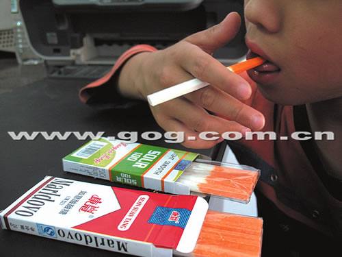 據(jù)家住安順市中華東路的劉女士講,他的兒子今年8歲,讀小學(xué)二年級。昨日上午,她看到兒子與三個小朋友在院子里玩時,突然發(fā)現(xiàn)他們每人手里都夾了一支香煙,不停地送到嘴里。劉女士見了,氣得幾步走到兒子的身旁,正要伸手教訓(xùn)兒子時,才發(fā)現(xiàn)這不是香煙,而是仿照香煙形狀的酸酸糖。兒子告訴劉女士,這些糖是他在附近的一個小攤子上用5角錢一包買來的,兒子還說,這種糖在他們學(xué)校附近也有賣,因為像香煙,大家都覺得好玩,好多男同學(xué)都在買,而且有的同學(xué)買來后,就像大人給別人敬煙一樣“敬”給關(guān)系好的同學(xué)“抽”。