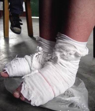 2007年整個(gè)冬天,小佳慧的腳都泡在冰水中,從不覺(jué)得冷的雙腳長(zhǎng)滿凍瘡,后來(lái)這些凍瘡化膿了。醫(yī)生說(shuō)她的雙腳已感染,如不及時(shí)治療就會(huì)爛掉。