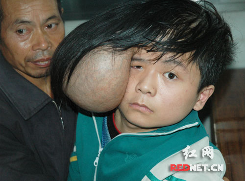 這名不幸的“雙頭”少年名叫梁樂(lè),來(lái)自湖南耒陽(yáng)。梁樂(lè)的父親梁某介紹,這個(gè)病兒子已經(jīng)患了10多年之久!皟鹤有〉臅r(shí)候頭很大,醫(yī)生檢查為腦積水,后來(lái)在衡陽(yáng)一所醫(yī)院開(kāi)了刀!绷耗痴f(shuō),過(guò)了一兩年兒子頭上突然長(zhǎng)了個(gè)雞蛋大的“瘤子”,之后,隨著年歲增長(zhǎng),“瘤子”越來(lái)越大,到現(xiàn)在都長(zhǎng)得有一個(gè)頭那么大了。由于兩個(gè)“頭”負(fù)擔(dān)太重,梁樂(lè)連站都站不穩(wěn),必須要父母親背著,每天晚上睡覺(jué)也只能仰著睡。