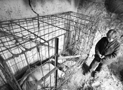 2000年起,無(wú)奈的父親焊接了一個(gè)大鐵籠,找來(lái)村里干部幫忙將兒子的雙手用繩索反綁,然后塞進(jìn)籠子中。