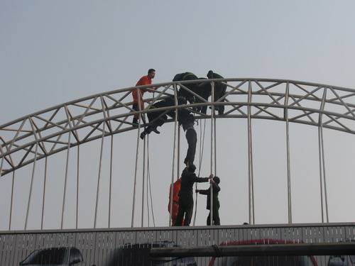 12月18日上午,許昌市一男子因100元工資糾紛,竟然攜帶汽油爬到位于市區(qū)解放路與許繼大道交叉口的鐵路立交橋附近一座十六七米高的廣告架上欲跳塔自焚,在勸說無果后,該男子飲下隨身攜帶的汽油后全身抽搐掛在半空中!關(guān)鍵時刻,數(shù)10名消防官兵一擁而上,成功將其從廣告架上救下送往醫(yī)院搶救。