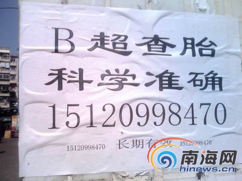 “只要你愿意花800元,肚子里懷的是男是女,一查便知!”連日來在?诘拇蠼中∠飪龋霈F(xiàn)了很多類似的廣告。那么,這一明顯違反國家規(guī)定的行為究竟是怎么回事呢?1月13日至1月14日,記者連續(xù)兩天進行暗訪,一探究竟。