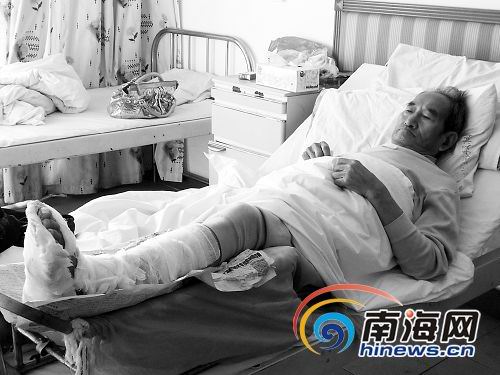 3日下午,記者在海南邊防醫(yī)院見到了受傷的張老漢。老人躺在病床上,左腳纏了繃帶并用木板固定住。張老漢回憶說,1日下午4點左右,他在博愛南路過馬路,打算去附近的東湖站臺乘坐剛到站的36路公交車。這時,一輛開往博愛南路方向的摩托車緊貼著他的身子急速行駛過來。摩托車后輪的輻條將他的左腳“拐”進車輪內(nèi),他覺得一陣鉆心的疼痛!爸,我被拖行了2米多,摩托車才停了下來,我趁機將腳抽出來,司機卻開著車跑了”。張老漢氣憤地說。