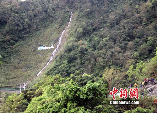 10月22日,臺(tái)灣“交通部觀光局”晚間表示,23日將以直升機(jī)救出停留在蘇花公路受災(zāi)處過(guò)夜,除仍失聯(lián)者外的全部14名大陸游客。圖為22日,臺(tái)灣救援直升機(jī)在受災(zāi)現(xiàn)場(chǎng)運(yùn)送游客脫險(xiǎn)。