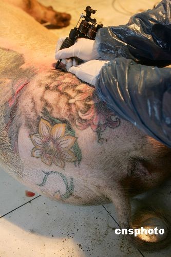 11月4日,記者前往比利時(shí)藝術(shù)家威姆德沃伊(Wim Delvoye)在北京郊區(qū)的“藝術(shù)農(nóng)場”,他在農(nóng)場里養(yǎng)的十幾頭豬只只價(jià)值連城,因?yàn)檫@些豬身上都被紋上包括世界知名品牌LV,或者人物、動(dòng)物、神話故事等卡通風(fēng)格圖案。這些紋身豬皮最高可賣到100萬元,因此這些紋身豬吃好喝好,過得比人還舒服。中新社發(fā) 富田 攝