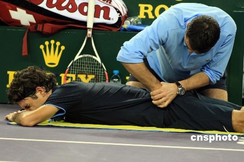 圖為比賽間隙費德勒在場邊療傷。中新社發(fā) 湯彥俊 攝