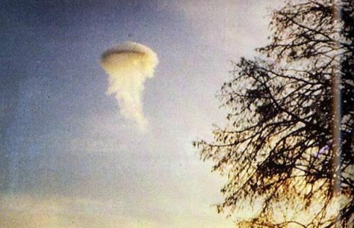 1974年11月17日早晨,勞爾森帶著他的愛(ài)犬在丹麥日德蘭半島散步,突然看到一團(tuán)白云里裹著一個(gè)外形奇特的物體。他在距離這個(gè)物體飛到大約250到300米遠(yuǎn)的地方時(shí)拍下了這張照片。