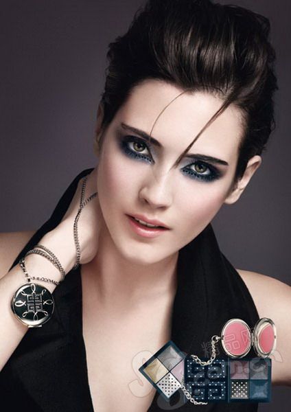 一面是陽剛,一面是陰柔——穿著女士西服,擁有精致的膚色。深邃的具有金屬及煙熏的眼部妝容,鮮粉紅色的嘴唇,充滿了魅惑的吸引。