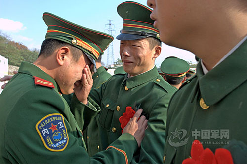 武警南京市支隊(duì)舉行退伍士兵歡送儀式,即將退伍的老兵和前來(lái)送別的戰(zhàn)士早已淚流滿面。中國(guó)軍網(wǎng)發(fā) 韓華攝