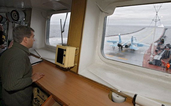 俄總統(tǒng)梅德韋杰夫在庫(kù)茲涅佐夫號(hào)航母上觀看穩(wěn)定2008軍演(資料圖)