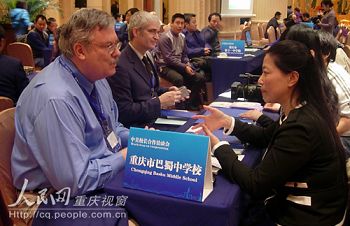 今日(8日)上午,重慶金科大酒店多功能會(huì)議廳內(nèi)人頭攢動(dòng),重慶多所中小學(xué)的校長及教員在各自展位上擺放好宣傳資料,等待有合作意向的美國校長前來洽談。美方的校長們在展位間穿梭,與“相中”的中方學(xué)校展開零距離的交流。漢語和英語在會(huì)場內(nèi)交替使用,使得這場中美漢語教學(xué)合作的“雙選會(huì)”氣氛格外熱烈。