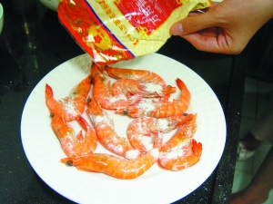 2 對(duì)蝦剪去尖刺和蝦須洗凈,用廚房紙吸干水分,灑上1/2杯萬用香炸粉,讓蝦身均勻地裹上一層香炸粉。