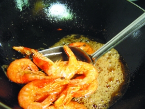 3 燒熱1碗油,放入對(duì)蝦開大火炸2分鐘,撈起用廚房紙吸干余油。