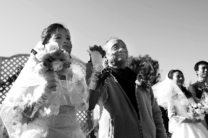 集體婚禮由一家婚戀網(wǎng)主辦,此次共有新人11對(duì),都是通過(guò)網(wǎng)絡(luò)走到一起的。吳介琴是中央美院退休教授,在新人里年齡最大,愛(ài)人蔣曉輝女士58歲,是成都鐵路系統(tǒng)退休員工。