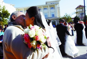 “你愿意做我妻子嗎?”81歲的吳介琴單膝跪地向愛(ài)人蔣曉輝求婚時(shí),在場(chǎng)親朋給予3分鐘的掌聲。昨日,與另十對(duì)網(wǎng)戀成功的情侶一起,81歲的吳介琴與小自己23歲的蔣曉輝走進(jìn)結(jié)婚殿堂;楹笏麄儗⒃谒拇ㄉ。