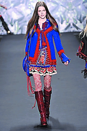 不愿意把沉悶帶進(jìn)秋冬的設(shè)計(jì)師大有人在。彩虹般的印花圖案、鮮活的色彩組合還有新藝術(shù)式的刺繡,更別提軋花皮革的靴子、天鵝絨花朵的頭飾、串珠項(xiàng)鏈和佩里斯紋緊身衣……今年秋冬的設(shè)計(jì)Anna Sui相對(duì)其歷次的發(fā)布,算是最華麗繁復(fù)的。對(duì)于Anna Sui粉絲來(lái)說(shuō),這種將具有不同歷史性的藝術(shù)風(fēng)格大膽混融的手法,相較于前幾季,則顯得較孤芳自賞,像是如虹光般的印花、或是熱情活潑的配色處理,以及一些刺繡花紋和手工雕刻過(guò)的靴款、天鵝絨印花帽飾、串珠項(xiàng)鏈、迷幻的渦紋花呢緊身上衣…等等,盡管花俏,卻也成為Anna Sui2008秋冬系列的一大特色。