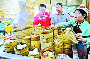 在陶陶居二樓,各式點(diǎn)心已經(jīng)一字排開,蝦餃、燒賣、叉燒包、腸粉、奶黃包、菠蘿包、蘿卜糕、粉果、榴蓮酥……“炸包沒有了!”開門不過十分鐘的時(shí)間,一名老伯正想要拿一份炸包,卻被告知已經(jīng)搶購一空。