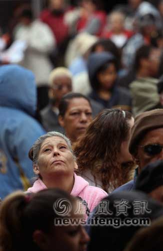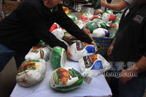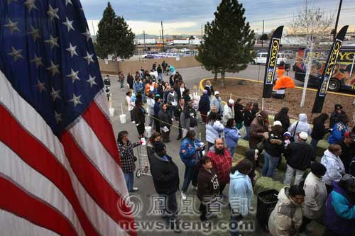 2008年11月25日,美國科羅拉多州丹佛市,人們在寒風(fēng)中排隊(duì)等待領(lǐng)取感恩節(jié)的免費(fèi)火雞和其他食物。丹佛市的慈善機(jī)構(gòu)計(jì)劃在感恩節(jié)之前向大約1200戶有需要的困難家庭發(fā)放感恩節(jié)食物。