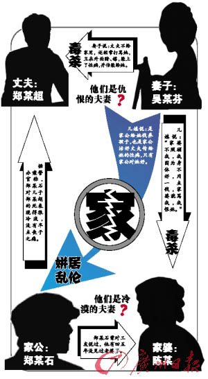 7月12日,廣西桂平人鄭某超開摩托車途經(jīng)封開時中毒身亡,妻子吳某芬不知去向。鄭某超一家的禍事一件接一件,身在廣州番禺打工的鄭母也離奇失蹤。專案組的民警通過近4個月的取證和調(diào)查,案情終于水落石出。11月,兇手吳某芬在湖南被抓,其對殺害丈夫與婆婆的犯罪事實供認不諱。據(jù)吳某芬交代,她之所以下此毒手,源于家庭不和,丈夫與婆婆對她不好,讓她記恨在心。一幕謀殺親夫、加害婆婆、與家公通奸的家庭悲劇由此而上演。封開警方昨日公布的這一案情讓人看后感慨萬千。