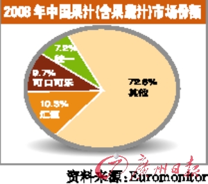 據(jù)國際研究公司Euromonitor給本報(bào)提供的統(tǒng)計(jì),去年中國果汁(含果蔬汁)市場份額中,統(tǒng)一排名僅次于匯源和可口可樂,以7.2%名列第三位。