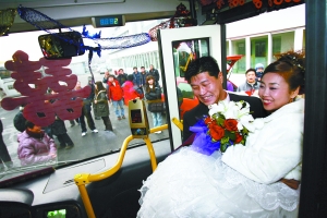 昨日,兩輛公交車成了一對新人的“重量級”婚車。新郎于浩是公交車司機,新娘賈春穎是公交站調(diào)度員。新郎抱著新娘上車時,司機說“先生請刷卡”。