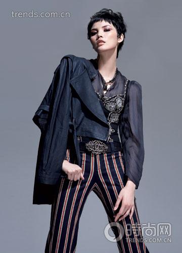 英式的褲裝搭配方式,添加古典繡花內(nèi)衣,外面加件皮衣便可出行。
