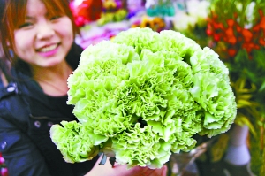 綠色代表健康、充滿活力。大家通常看到的康乃馨大都是紅、黃、粉為主,綠色康乃馨因培植技術(shù)復(fù)雜等原因,極其罕見。在追求環(huán)保、簡(jiǎn)約、時(shí)尚的三八婦女節(jié)為女性朋友送上一束綠色的康乃馨別有一番寓意。(劉潔攝)