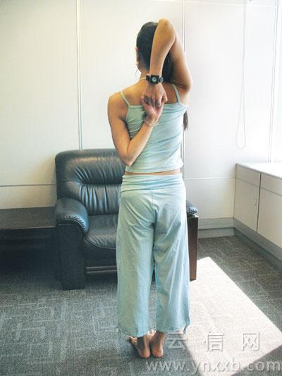 動(dòng)作要領(lǐng):站立或坐在椅子上,保持脊背直立,把右臂高舉過頭,彎曲右肘,試圖把右手放到兩肩胛骨之間。放下左臂,彎曲左肘,把左前臂收向背部,直到右手手指能和左手手指相扣。正常呼吸,保持姿勢5-20秒鐘,然后換方向重復(fù)動(dòng)作。別看很簡單,做起來難度很大的哦!