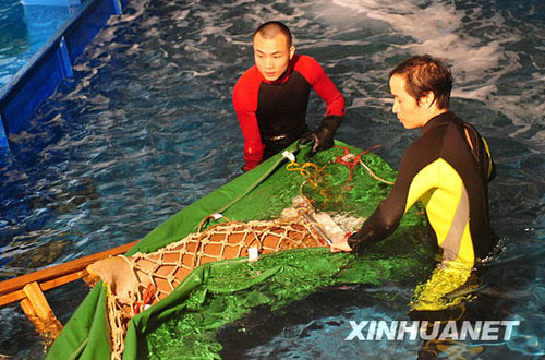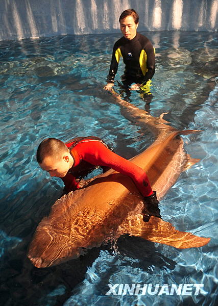 當(dāng)日晚,廣東省漁政部門從廣州一家酒樓解救出一條護士鯊,并將其送到廣東省水生野生動物救護基地。據(jù)悉,此護士鯊為廣州某酒樓從水產(chǎn)市場購得,在酒樓水族箱里展示,接受食客們的預(yù)定。環(huán)保人士獲知后前往酒樓抗議護鯊,漁政部門隨即前往酒樓將其救出。護士鯊屬于廣東省野生保護動物,受到廣東地方保護法保護。新華社記者 盧漢欣 攝