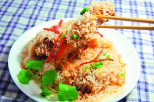 材料:特級肋排(2根,360克)、糯米(250克)、紅椒(半只)、蔥花(1湯匙)