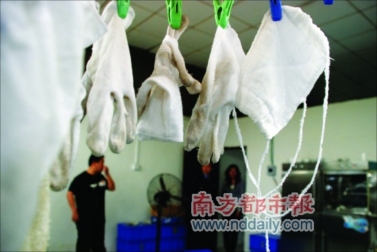 “要客戶(hù)收貨,就一定要讓所有的餐具上不能有一點(diǎn)油漬和殘?jiān),所以餐具打包裝之前,一定要用手套或毛巾擦干凈!崩习迥飳(duì)記者說(shuō)。然而,用于擦拭餐具的手套、毛巾都是隨處擺放,有的掛在電風(fēng)扇上,有的甚至放在地上。大部分手套的指尖部位都已經(jīng)發(fā)黑,甚至磨破了。
