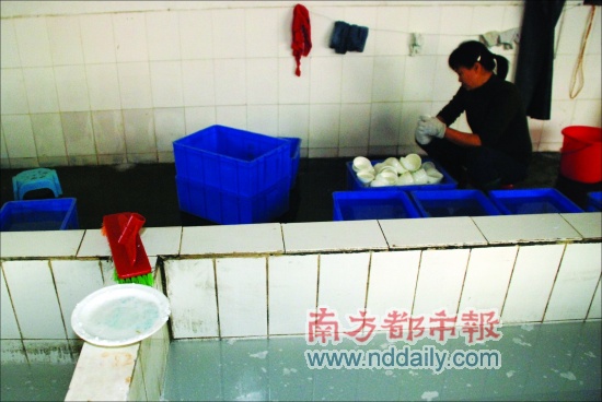 在這些水池旁邊,還有四五個(gè)盛滿(mǎn)水的藍(lán)色塑料箱,有一個(gè)箱子里表面上浮著泡沫,另外幾個(gè)的水則相對(duì)較清。這些塑料箱里均放滿(mǎn)了各種餐具,旁邊的地上還放著各種餐具,三四名女工正圍著這些塑料箱洗碗。一名女工表示,箱子里分別是洗潔精、漂白水和清水,用洗潔精洗過(guò)后,放在漂白水里漂兩次,再在清水里涮一下就行了。記者發(fā)現(xiàn),箱子里的水長(zhǎng)時(shí)間不更換,即使是清水也有一股濃濃的異味。