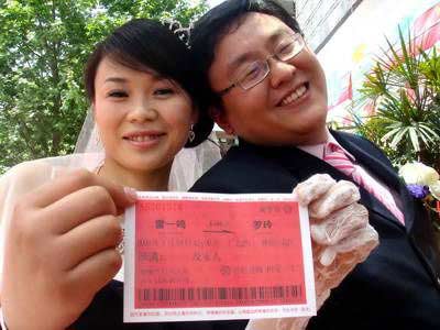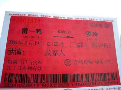 “太牛了,簡(jiǎn)直就是個(gè)牛人!弊蛉罩形11時(shí)多,在婚禮現(xiàn)場(chǎng),新郎的好友楊先生拿著明信片大小的“火車票”對(duì)記者說(shuō),原來(lái)來(lái)賓們手中所持的“火車票”都是結(jié)婚請(qǐng)柬,是由新郎雷一鳴自己設(shè)計(jì)的。