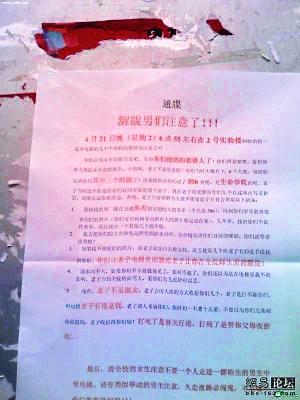 事情源于該女生在4月21日晚的一次不愉快的電梯經(jīng)歷。據(jù)稱,當(dāng)晚6點(diǎn)55分左右,該位女生在2號(hào)實(shí)驗(yàn)樓與幾個(gè)“齷齪男”一起乘電梯。期間,女生慘遭“齷齪男”們毛手毛腳。雖然當(dāng)時(shí)十分憤怒,但鑒于一個(gè)人“勢(shì)單力薄”,被“猥褻”的女生忍著沒有作聲。她暗暗記下了幾個(gè)“齷齪男”上課的實(shí)驗(yàn)室,并寫下這張大字報(bào),貼在大學(xué)校園內(nèi)。
