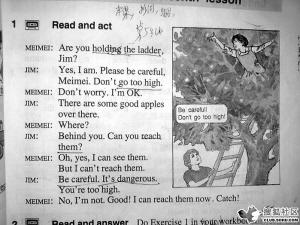 大家去學(xué)農(nóng)去摘蘋(píng)果,Han Meimei爬在梯子上,Jim就很緊張地在下面喊“Be careful!”(當(dāng)年的英文教材)