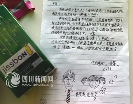 文中這樣寫(xiě)道:“首先祝您父親節(jié)快樂(lè),我今天送您一個(gè)特別的禮物,希望您不要生氣哦!知道您經(jīng)常在外應(yīng)酬,還要經(jīng)常出差,為這個(gè)家又當(dāng)?shù)之?dāng)媽。為了您的健康也是為了您的生活更快樂(lè),我悄悄幫您買(mǎi)的最新款的TT哦!以前偷偷看到您的抽屜里是這個(gè)牌子的……”言語(yǔ)中,透露出女兒對(duì)父親的感激之情。最后,女兒還俏皮的說(shuō)“希望您接受女兒的一片心意!!哈哈……在此祝您節(jié)日快樂(lè)!也希望您能早點(diǎn)找個(gè)漂亮的女朋友哦,嘻嘻……放心,我不會(huì)給媽媽說(shuō)的!”小女孩通篇用語(yǔ)樸實(shí)無(wú)華,天真無(wú)邪,讀來(lái)讓人感動(dòng)。