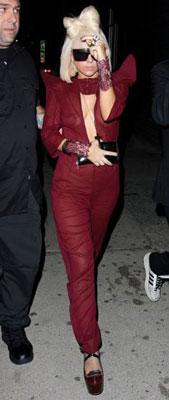 Lady Gaga品位獨特,著裝常成為議論焦點。近日上街時,她穿著了一件暗紅色半透明的連體衣,復古墊肩設計是潮流指標,性感的深V領則為Gaga的一貫作風。她能將一本正經的連體衣穿出自己的風格,想突出風格就得敢穿敢為。