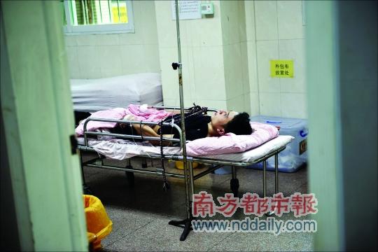 在番禺市橋醫(yī)院急診室內(nèi),撞車男子躺在病床上接受治療,為了保證安全,警察用繩索將其身體固定起來。男子情緒已趨于穩(wěn)定,只是因?yàn)橹暗淖矒,頭部有明顯傷口。