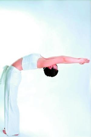 這是瑜伽中的“拱橋”動(dòng)作,對(duì)久坐者的腰椎很有好處,難度也比較大。沒有瑜伽基礎(chǔ)的人可以簡化動(dòng)作: 先仰臥,腿微屈,用手肘把身體支撐成一個(gè)拱形。