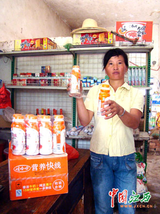 當(dāng)日上午,記者驅(qū)車來到墩上村實(shí)地采訪。今年41歲的鄒根枝兒女都在外務(wù)工,和丈夫鄒新海兩人在家?guī)腿搜b殼子板,每天120多元的收入讓兩人很是滿足,平時(shí)除了吃飯外還特意買些原料補(bǔ)充營養(yǎng)。鄒根枝介紹說:“6月20日,我從墩上村鄒德水的便利店里買來一箱娃哈哈營養(yǎng)快線,當(dāng)時(shí)怕飲料不新鮮,還特意看了生產(chǎn)日期,見是2009年5月31日生產(chǎn)的才放心買了回去,放在家里晚上看電視的時(shí)候喝,有些時(shí)候我老公(鄒新海)也喝一瓶,但沒有我喝得多。幾天后,我感覺肚子不舒服,上吐下瀉,為此專程搭車到萬年縣石鎮(zhèn)街去買胃藥,花了差不多200元錢病情卻不見好轉(zhuǎn),而且肚子痛得特別厲害。沒有辦法,我只好到屋前的墩上衛(wèi)生所去看病,打了幾天吊針以后病情才有所好轉(zhuǎn)。這次看病不僅花費(fèi)了近400元醫(yī)藥費(fèi),還耽誤了一個(gè)多星期沒有干活,就連前兩天插秧都是請人干得,我的損失可大了。”
