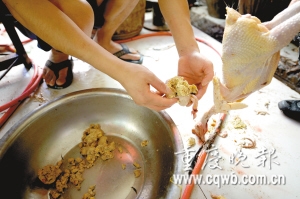 昨上午,四家經(jīng)營戶之一、在興隆街經(jīng)營了12年活雞鴨生意的劉德彬(化名)說,近兩年,自貴州運來自稱是“土雞”,出現(xiàn)一種怪現(xiàn)象:雞胃被灌了一種“飼料”——用石粉攪成糊狀,再加幾粒玉米!斑@種雞每只比正常喂養(yǎng)雞至少重0.25公斤以上……我實在看不下去了,幾經(jīng)考慮才說出這個秘密!