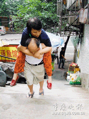 沒有其他生活來源,樓下臨街的煙攤是夫妻倆唯一的生活希望,兩人24小時(shí)輪流守候。妻子因病無法行走,殘疾丈夫每天要背她上下樓梯58步。11年來,沙坪壩區(qū)的周靈夫婦風(fēng)雨無阻地走過了9萬步樓梯。