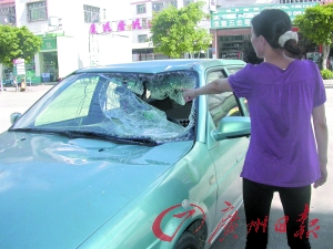 前日晚上11時(shí),記者接報(bào)趕到清溪鎮(zhèn)廈坭市場的附近,記者看到,一輛綠色小轎車的擋風(fēng)玻璃被砸了一個(gè)大窟窿,車頭也有輕微凹陷,一縷暗紅的血跡仍清晰可見。