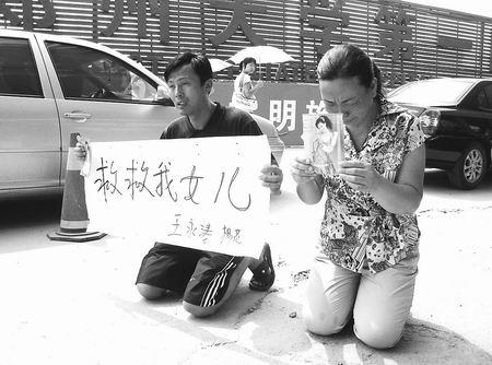 記者迅速趕到鄭州大學(xué)第一附屬醫(yī)院門口,在人行道上,跪著一對年齡在46歲左右的男女,他們舉著一張白紙,上面寫著“救救我女兒”的字樣,下面寫著他們兩人的名字王永濤和楊花。“你們?yōu)槭裁催@樣做呢?”記者問,聽到記者的問話,兩人同時流下了淚水,他們拿出了多張女兒的照片:“那是孩子去年照的,現(xiàn)在孩子已變了個樣子!”記者看到,他們的女兒王曉燕清純漂亮,笑容里充滿著對未來人生美好的憧憬。