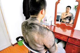 炎熱的夏天,23歲的小宋還穿著長(zhǎng)袖衣服,熱得滿頭大汗。“不是我不怕熱,我是怕別人看到我身上的黑色‘毛坎肩’,又對(duì)我指指點(diǎn)點(diǎn)!毙∷慰谥械拿布纾鋵(shí)是已經(jīng)伴隨了他20多年的黑毛胎記。