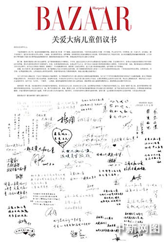 中新網(wǎng)8月10日電 今日,時尚雜志《時尚芭莎》攜手百位明星、名流和企業(yè)家發(fā)起聯(lián)名倡議,呼吁政府相關部門、各級慈善公益組織,共同關注中國大病兒童這一弱勢群體的生存、救助問題。同時,《時尚芭莎》宣布將于9月底在京舉行,本屆活動募集的所有善款都將全部捐助給國內(nèi)大病兒童救助公益事業(yè),以此慈善盛舉向偉大祖國六十華誕獻禮。