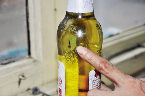 黃先生的餐館開在福清漁溪鎮(zhèn),昨日,在餐館里記者看到這瓶啤酒,其瓶蓋仍完好無損,上面標注著生產(chǎn)日期為“2009年7月16日”,尚在保質(zhì)期內(nèi),生產(chǎn)商是福建燕京惠泉啤酒股份有限公司,啤酒瓶內(nèi)漂浮著兩個指甲大小的“蝌蚪”狀黑色物質(zhì)。一名顧客說:“真惡心!”