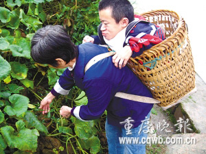 昨日上午,天空飄著細雨。巴南區(qū)南彭鎮(zhèn)鴛鴦村一條泥濘的鄉(xiāng)間小路上,一位身穿藍色外套、腳穿解放鞋,身體瘦弱的老婦人,背著一個小背篼,背篼里裝著一個面相30多歲、身高只有幾十厘米的男子,緩慢地走在路上。