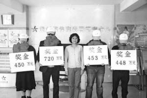 網(wǎng)民點評:從圖上來看,中獎獎金是從貴州省體育彩票管理中心頒出的,領(lǐng)獎人頭戴棒球帽,胸前戴朵大紅花,為了不被拍到正面,全都低下了腦袋!邦I(lǐng)獎該高興啊,從這圖來看,怎么看都是很沮喪!本W(wǎng)民說,下次再有中獎?wù),干脆搞個蒙面舞會。